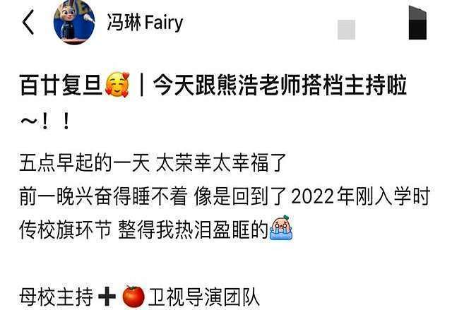 冯琳也在个东谈主吩咐媒体上共享了这次主捏的感受。她坦言,主捏前夕慷慨难眠,仿佛重回2022年入学时参与校旗传递的场景。能够参与这次校庆主捏,她深感荣幸与幸福。