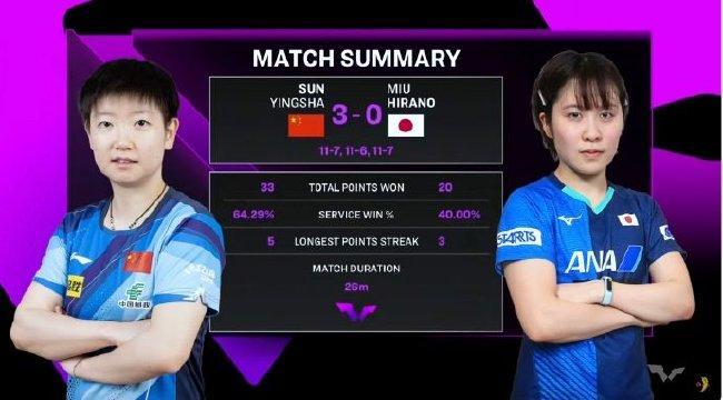 孙颖莎只用时26分03秒,就直落三局,3-0(11-7/11-6/11-7)横扫日本选手平野好意思宇,晋级16强。